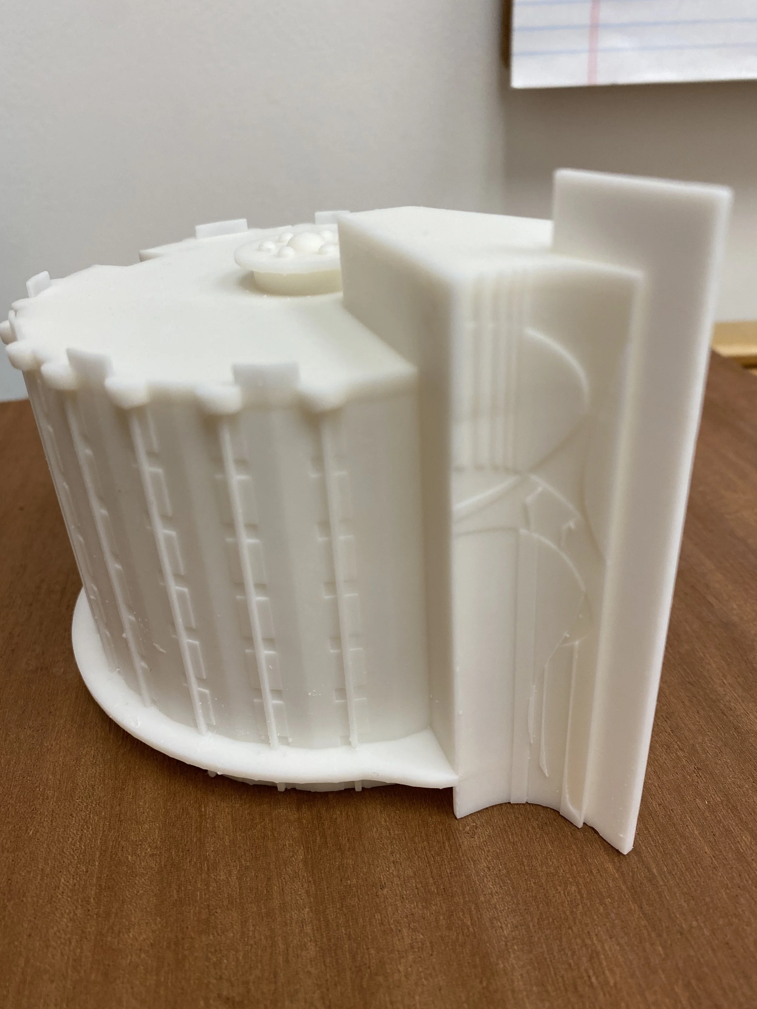 This award was produced by undergraduate student Shambil Kahn in memory of Lou Wolff, a local south Florida architect, whose family provides annual scholarships to FAU architecture students. The round building in the images below is from an original design by Lou Wolff. The original building has since been remodeled, so the student was required to use the architect’s original drawings to create a 3D model for printing. The mural on the building is an iconic element, so Kahn collaborated with other students and faculty to create a topographical interpretation of the design to showcase this element in the final 3D print.